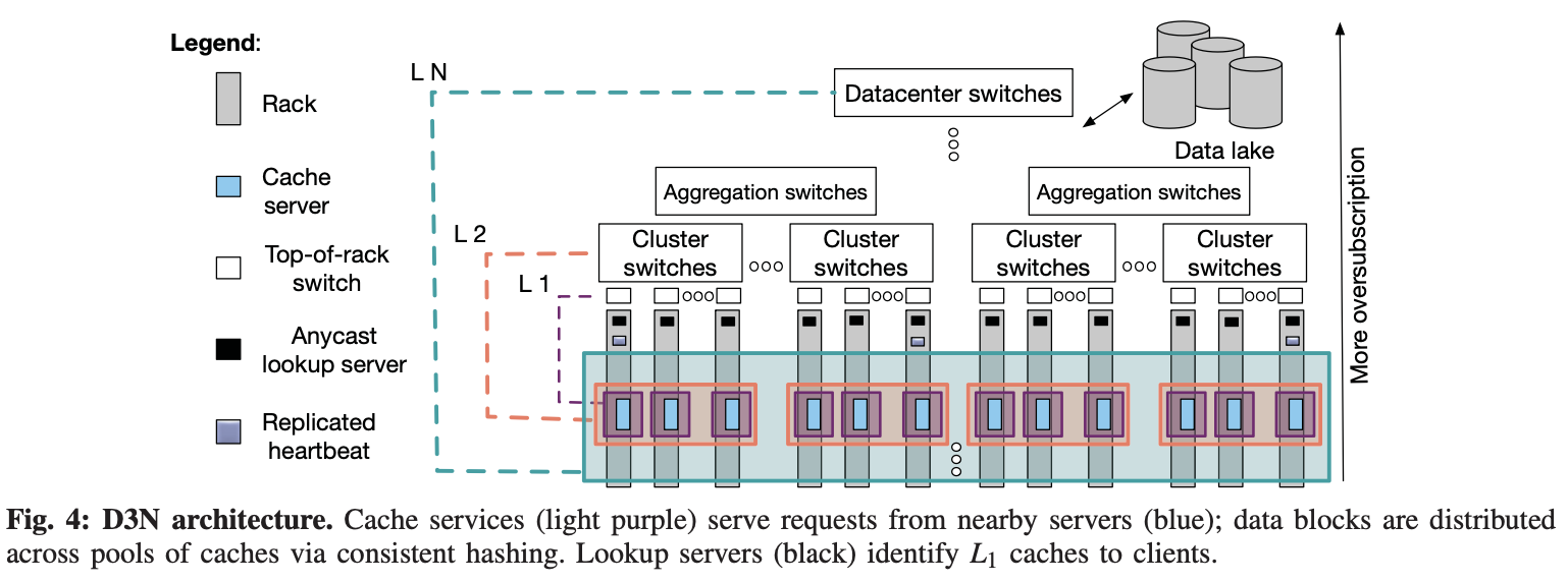 - Local cache management: Since caching decisions are performed locally within the cache pools in each layer, D3N can make globally suboptimal caching decisions. For example, a few popular blocks can be replicated across all the L1 caches flooding the capacity and preventing caching of slightly less popular blocks.