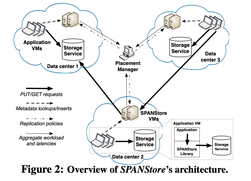 - 第三点的细节没看懂:To keep costs low, we ensure that all data is largely exchanged directly between application virtual machines (VMs) and the storage services that SPANStore builds upon; VMs provisioned by SPANStore itself rather than by application provider are predominantly involved only in metadata operations.