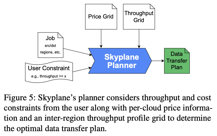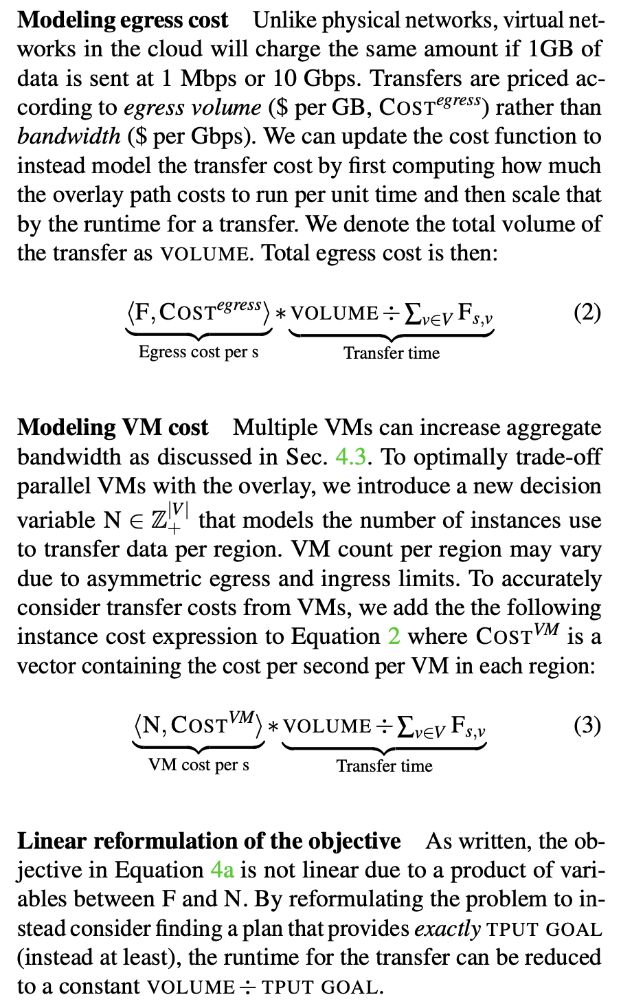 这里引入了一个假设 high statistical multiplexing: Single user’s bandwidth usage is negligible, thus Skyplane can compute a data transfer plan without regard to other users’ bulk transfer.