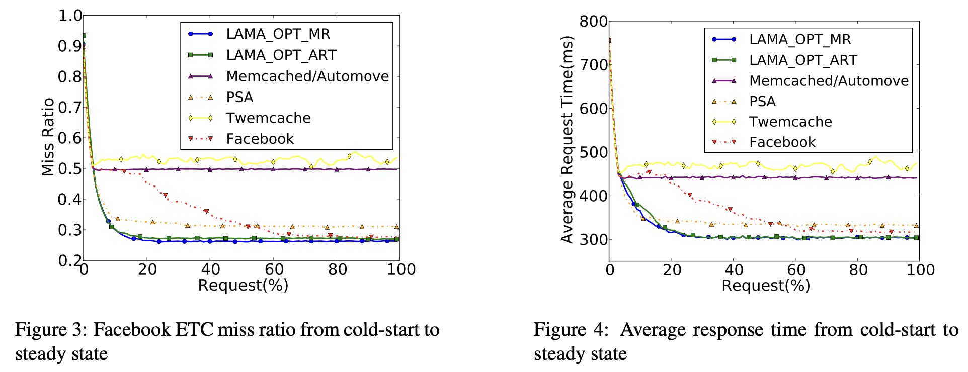 另一个值得注意的是 LAMA 有两个略显丑陋的参数,the repartitioning interval M, which is the number of items accesses before repartitioning; and the reassignment upper bound N, which is the maximal number of slabs reassigned at repartitioning。