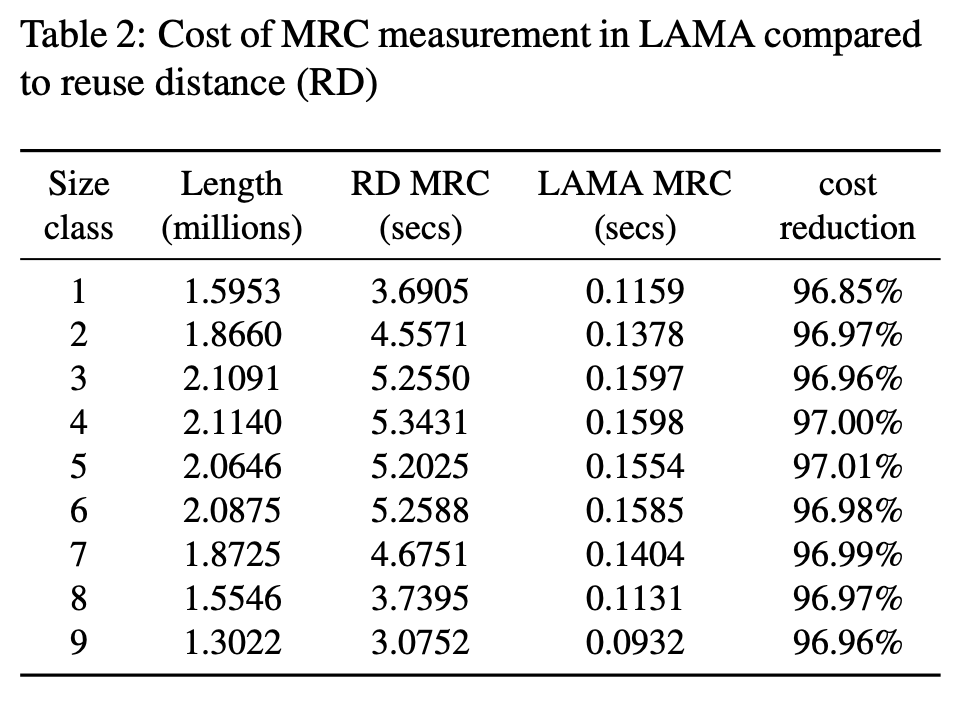 LAMA 还声称 MRC overhead 很小,相比 reuse-distance-based MRC generation(但没说具体用了什么 RD 算法),这个算法复杂度我下一篇文章对比一下:
